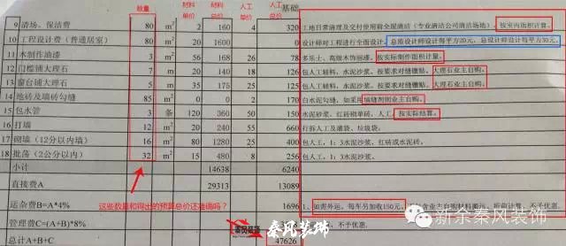 一般施工隊(duì)在每項(xiàng)報(bào)價(jià)后面會(huì)注明是用什么材料及施工工藝,比如墻面漆30元/平方米,應(yīng)注明對(duì)于墻面基層的處理工藝,如刮幾遍膩?zhàn)诱移剑槟z漆的品牌型號(hào)及涂刷工藝,如刷前加一遍底漆及乳膠漆加水的百分比和滾涂遍數(shù)等。還有一些額外的預(yù)算,報(bào)價(jià)的時(shí)候一定要提前告知業(yè)主,比如墻面底基找平處理,地面找平等,還有瓷磚規(guī)格過(guò)大或過(guò)小,都要加錢的,這些收費(fèi)項(xiàng)目施工方都應(yīng)提前告知業(yè)主或者有備注說(shuō)明,如果在預(yù)算中不寫上,到現(xiàn)場(chǎng)施工時(shí)才提出來(lái),面對(duì)突然多出來(lái)的費(fèi)用,一般業(yè)主會(huì)難以接受。